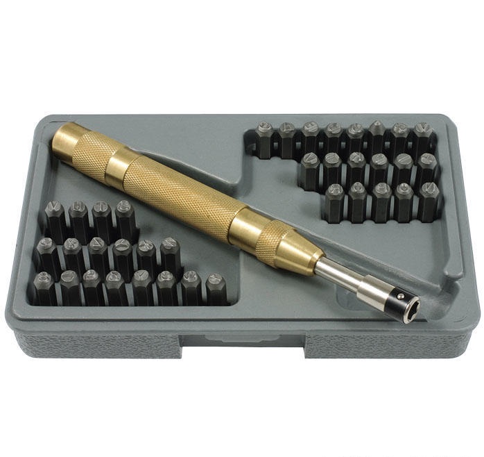 Tällä sarjalla voit helposti merkitä puuta ja karkaisematonta metallia. Pyälletty (kohokuvioitu) messinkikahva toimii jousikuormituksella, vasaraa ei tarvita. Aseta vain kirjain- tai numerobitti kuusiokololiittimeen ja paina alas. Kirjasimet ovat n. 4 mm korkea. Toimitetaan muovilaatikossa.