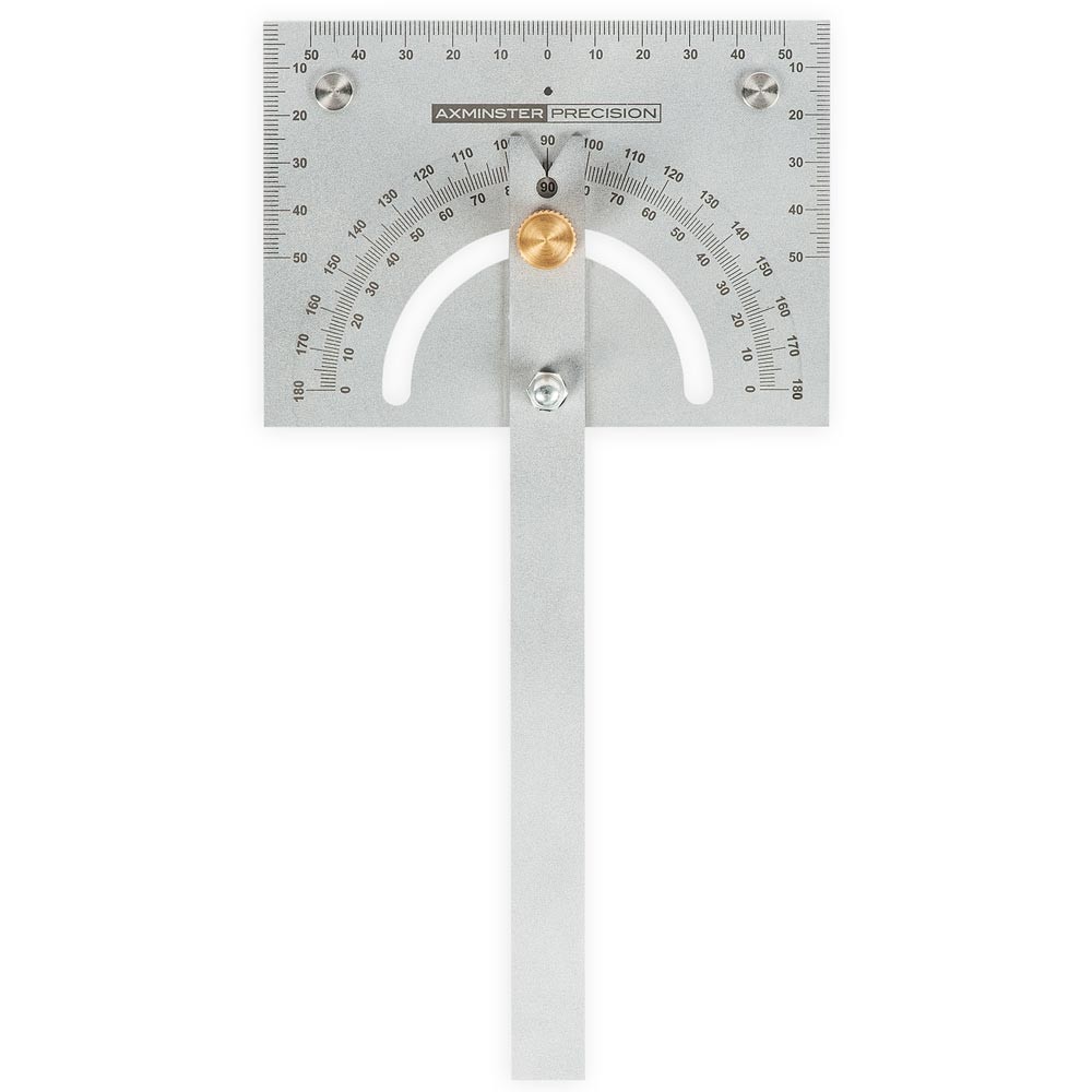 The Precision Protractor head is 2 mm thick, Japanese stainless steel with a satin-chrome, anti-glare finish. It is 120 mm x 90 mm, the 180° scale starts at 0° in the centre to 90° on either side. All graduations are photo-chemically-etched and black filled for clarity.