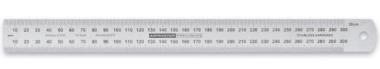 Individually tested, includes calibration certificate Satin chrome anti-glare finish, extremely easy to read Permanent, black filled scale markings Rule width: 25mm, thickness: 1mm EC Class 1 accuracy: ± 0.2mm full scale, constant at 20°C