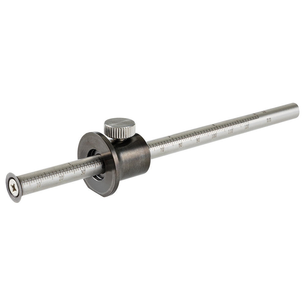 Tämä ruostumattomasta teräksestä valmistettu suuntaispiirrin tekee vaikutuksen samanaikaisesti korkealla merkintätarkkuudellaan ja kompaktilla muodollaan. Akseli on karkaistu ja lukitusruuvissa on sisäänvalettu messinkinen puristustappi, joka estää painojäljet akseliin ja pitää asteikon pysyvästi luettavana. Syövytetty säätöasteikko.