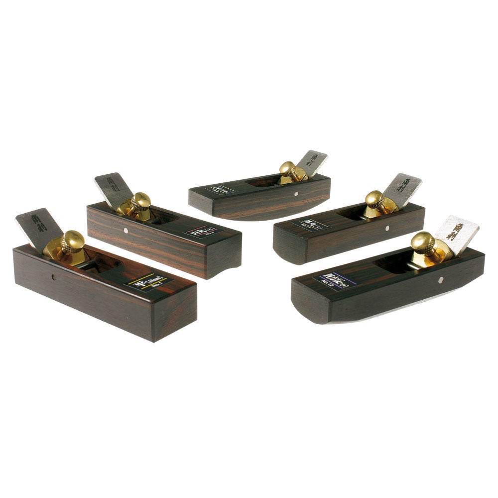 Runko eloisaa, rakeista Macassar-eebenpuuta ja kiillotettua messinkiä, HSS-terät (64 HRC). Litteä, kovera, kupera, veneen muotoinen, pyöreä pohja.