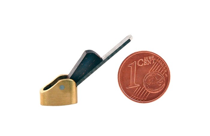 Maailman pienin höylä: pituus vain 12 mm ja terän leveys 4 mm! Tämä on pienin koskaan sarjassa valmistettu oikeasti toimiva höylä. Viulunrakentajien käyttämä pintojen kovertamiseen. Messinkirunko kaarevalla pohjalla, ruusupuukiila. Ebenpuinen kotelo.