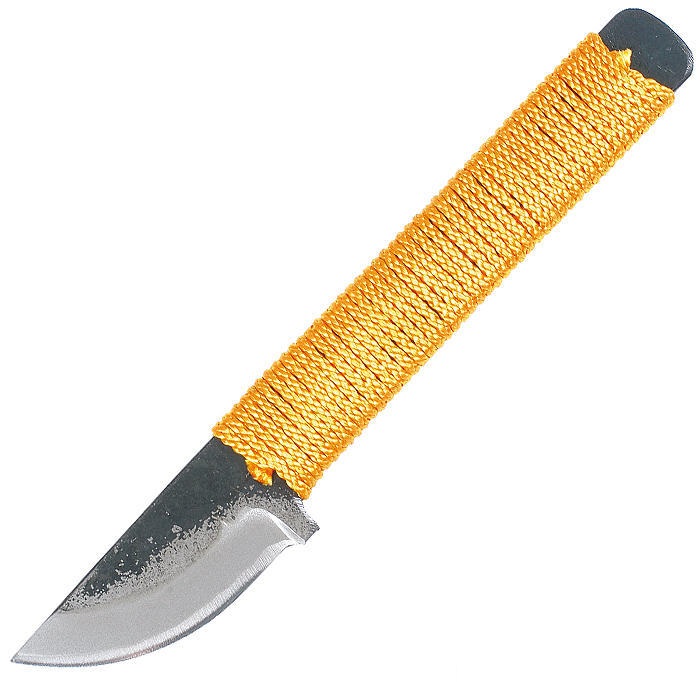 Similar to the handles of Samurai swords, the handle of this Japanese carving knife is bound with silk cord. Slip-proof in the hand, it can be precisely guided, even with increased application of force. Triple-layered blade, core layer of Blue Paper Steel, hand guard, double bevel.
