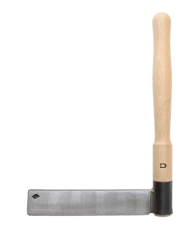This splitting knife excels through its shape, which has been developed and improved over many centuries. The turned, untreated handle with cross-wedging is fixed in the conical eye of the iron, and due to its shape is very comfortable to hold. The cutting edge, which is made of carbon steel with approx. 55 HRC, easily splits shingles and battens. Splitting knives are hit with the rawhide hammer