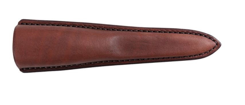 Leather sheath made of vegetable-tanned leather with integrated belt clip.