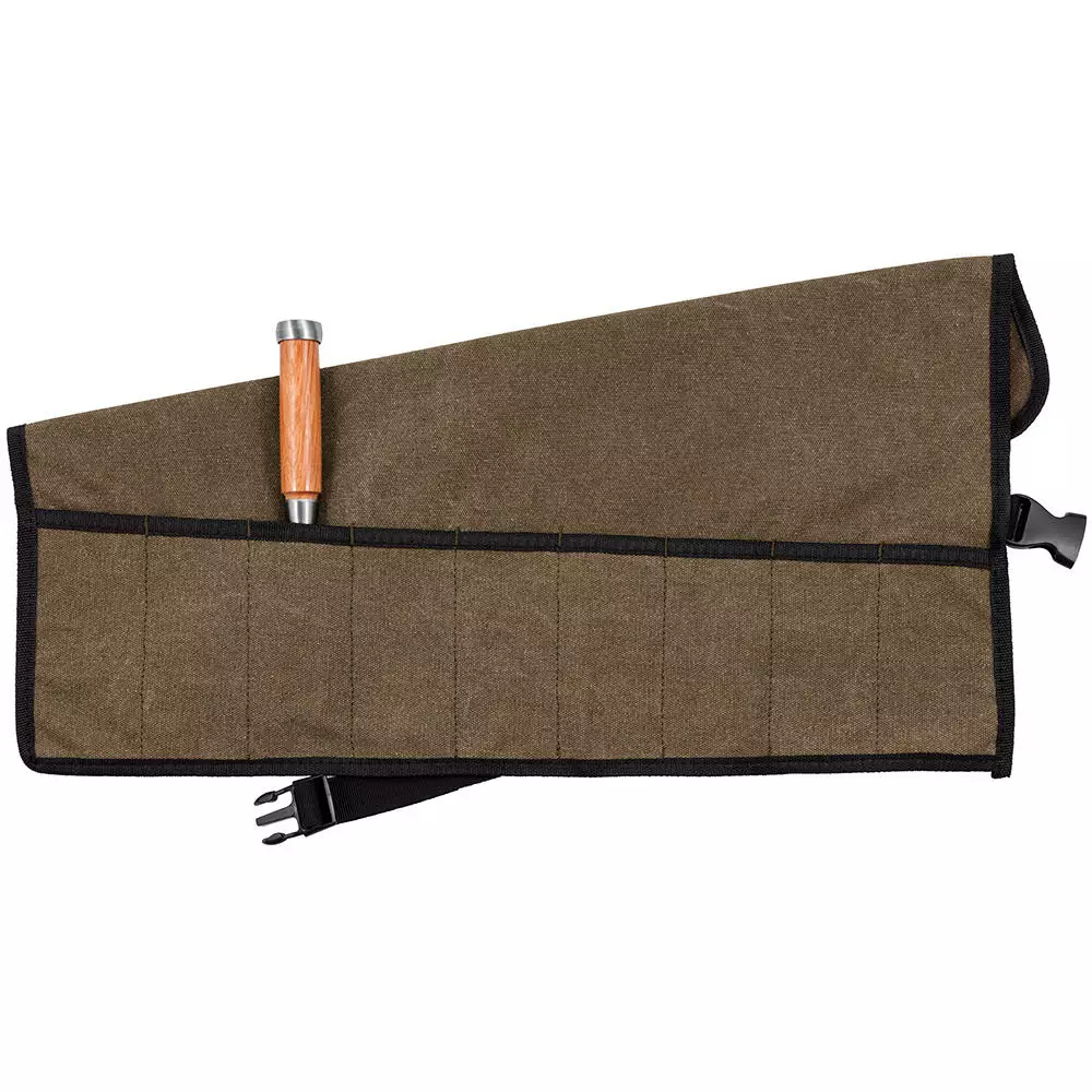 Strong, impregnated cotton fabric rollup case. Belt with snap fastener. As the tools can only be inserted from one side, and are secured by a flap, they cannot fall out.Outer dimensions 710 x 430 mm