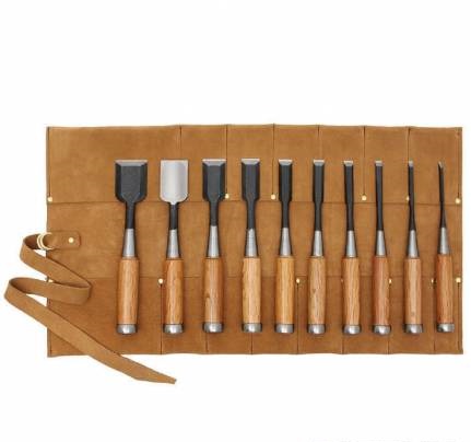 Hyvin muotoillut taltat kestävillä kaksikerroksisilla terillä (jyrsetty teräs). Vahatut kahvat japanilaisesta punaisesta tammesta, esiasennetut vanteet.