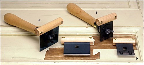 For any major scraping work, nothing beats a ball-joint scraper. The handle can be set anywhere in a 70° cone, allowing a comfortable grip and effective blade orientation in virtually any circumstance. The handle unlocks or locks solidly with a quarter turn. Another advance on its predecessors is the hand rest on the blade. Substantial pressure can be applied to speed work.