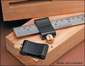 The Veritas ruler stop increases the usefulness of a metal ruler by providing a solid reference point. It is ideal for setting saw fences, repeat cuts, etc.