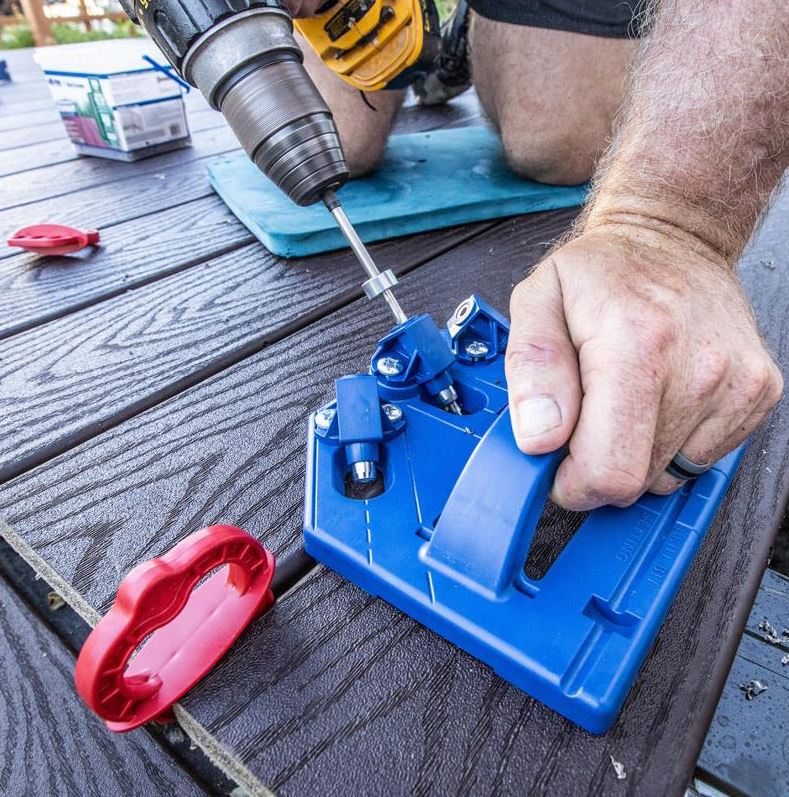 Ajattele, terassi jossa ei näy yhtään naulaa tai ruuvia, olisihan se siisti. Nyt se on mahdollista. Kregin uudella poraus- ja ruuvausjigillä teet ennennäkemättömän hienoja ja lujia terasseja, laitureita ja rappuja. Ei näy nauloja eikä ruuveja, ei. Ruuvit porataan viistoon laudan kumpaankin reunaan ja ovat näin lähes näkymättömiä, eikä niihin kerry vettä tai lunta kuten päältäpäin lyötyjen naulojen tai ruuvattujen ruuvien kantojen kohdalla. Helppokäyttöinen jigi ohjaa oikeaan poraus- ja ruuvaussyvyyteen. Välikappaleilla raot pysyvät vakiolevyisinä.