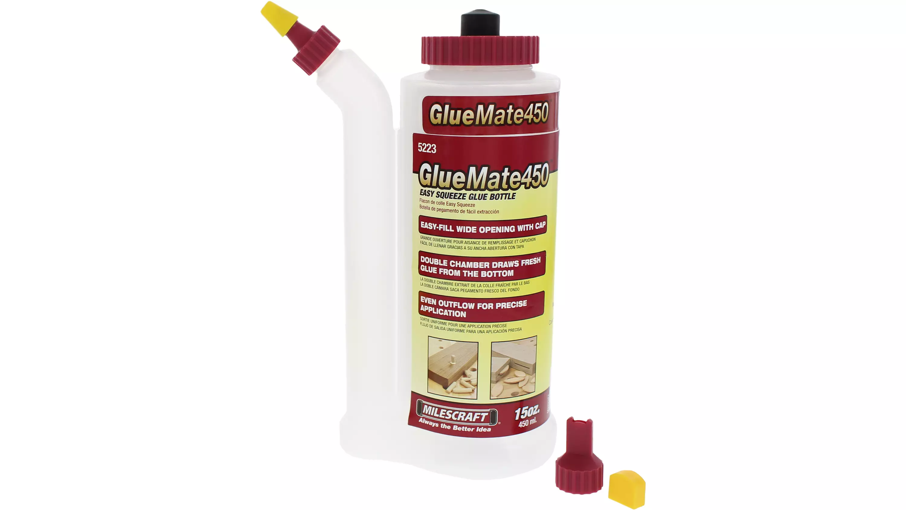 Milescraftin Gluemate 450 on täydellinen liimauslisävaruste kaikille puuntyöstäjille. Kätevä liimapullo varmistaa nopean ja tarkan käytön jopa hyvin pienille työkappaleille. Salaisuus on kaksoiskammion suunnittelu. Kun painetta kohdistetaan, annosteluapu mahdollistaa liiman levittämisen täydellisesti, sekä vaakasuoraan että pystysuunnassa.