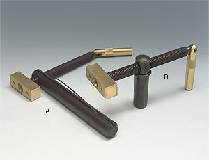 Steel post and screw with black oxide finish, solid brass clamp head and handle Wonder Dog post is 6-1/2" and is drilled and tapped at a 3° angle; side spring smoothly adjusts clamp head at any desired projection Wonder Pup post is 2-3/4"; rubber O-ring around dog post allows for height adjustment Installs in a 3/4" hole; pivots in any direction clamping is required; easy-adjusting handle provides ample clamping pressure in any position Since dog head has two screw holes, any tip shape can be cut with a scroll saw and attached for specialized work Made in Canada