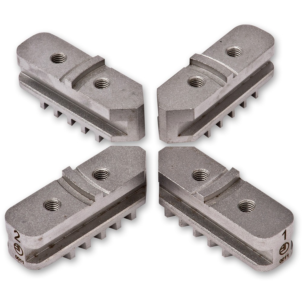 Manufactured in our own machine shop in Axminster, these long accessory mounting jaws designed for the Evolution chuck are unrivalled for quality and precision. We like to call them SafetyJaws because a unique feature of these jaws is that if extended beyond the body of the chuck, the edges have been modified with a slight radius to minimise the chance of injury should hands get too close to the rotating chuck during use. Now supplied as standard with our Evolution chuck, a set of these for each of your additional jaw sets will make the swapping of jaws much faster and more efficient. N.B. For Clubman K10 and K8 woodturning chucks use standard accessory mounting jaws 951367.