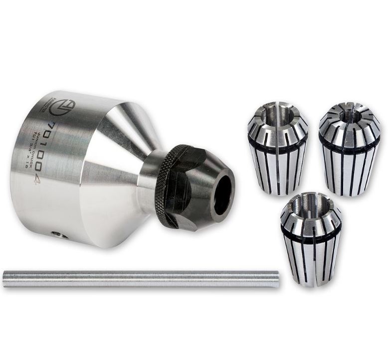 The Axminster Junior chuck is the first true collet chuck to be produced with woodturners specifically in mind. In this chuck we use our successful ER20 engineering collets which are precision machined to grip evenly along their whole length without marking the work. The chuck is supplied with three collets: 7 to 6mm, 11 to 10mm and 13 to 12mm and there is a range of additional ones available which together give a gripping range from 2mm to 13mm diameter. The collet is tightened by means of a nut which has both a knurled section and spanner flats to give two tightening options and also features an ejection ring for easy release. The Junior chuck has been designed with the miniaturist in mind and its ability to handle long lengths of dowel (in conjunction with a hollow headstock) make it particularly useful for repeat production of small items.