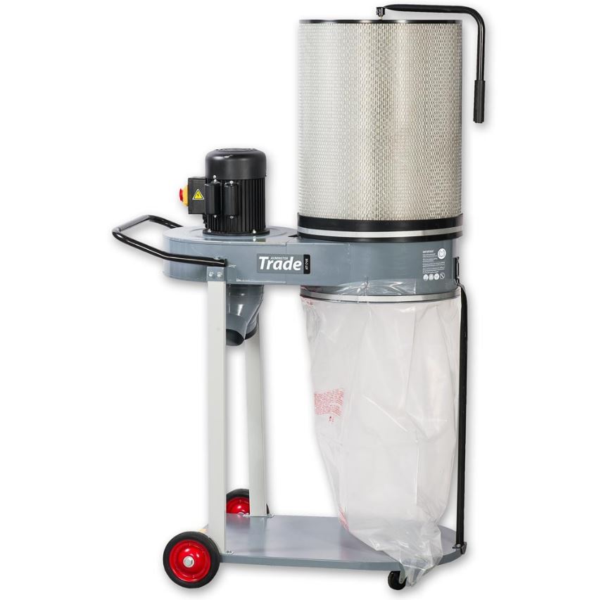 A thoroughly modern design of mobile dust extractor with a cartridge filter included as standard. The excellent performance comes from careful matching of the motor, impeller and housing, resulting in a quietly efficient machine able to extract chips and medium sized dust from almost all Trade specification machinery. An alloy impeller is fitted to reduce the risk of sparks and the extra large cartridge filter has a rating of 1 micron @ 100% capture rate. A large capacity plastic waste sack and quick release straps are included. A comfortable tubular handle, steel rear wheels and front castor wheels are provided for easy mobility. The cartridge filter increases the potential use of this machine to include sanders as well as the normal range of saws, planers etc. The filter is easy to keep clean with the top mounted crank handle, the extra surface area means that the overall airflow is not reduced. Overall, a fine, modern extractor for any trade workshop. Hose not supplied. N.B. 16amp supply is required.