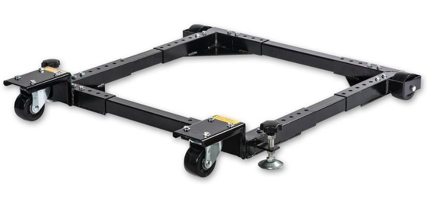 This heavy duty mobile machine base with its two fixed and two castoring wheels is a convenient way to enable heavier machines or work stations to be moved around the workshop. Once the machine is positioned, the castoring front wheels can be raised with the screw-in feet to allow the base to rest securely on the floor. Maximum total load is 450kg and the size limits are 570mm square up to 750mm square or 570 x 750mm up to 870 x 750mm rectangular. Very well made and easy to use.
