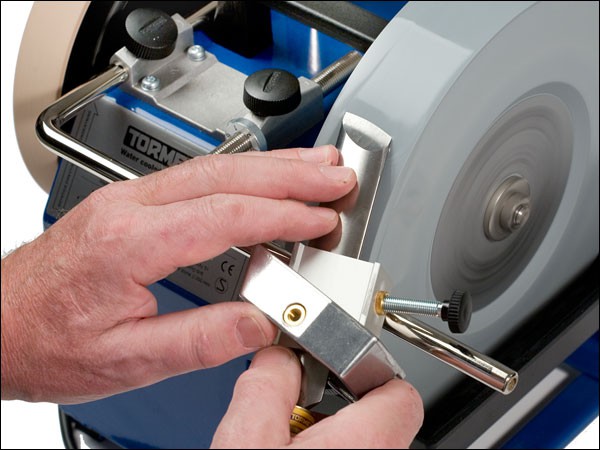 Tämä patentoitu hiontaohjain sisältää rungon (1) ja kaksi vaihdettavaa istukkaa: yksi suljettu (2) ja yksi avoin (3). Istukat pääsevät kääntymään ja ne voidaan lukita nuppiruuvilla (6) mihin tahansa vinokulmaan välillä 0–45°. Sorvaustaltoissa on symmetriset viisteet kummallakin puolella. Tällä hiontaohjaimella voidaan hioa molemmat viisteet irrottamatta työkalua välillä ohjaimesta. Hiontaohjaimen kääntäminen ylösalaisin mahdollistaa viisteiden symmetrisen hionnan.