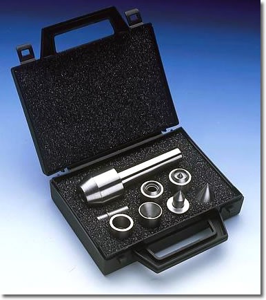 Hollow Revolving Centres are available in 1 and 2 morse taper. In addition to the basic unit there is also a set of with six different accesories - ring centre, hollow centre, location pin, 60 degree point, mini 60 degree point, and cup centre. These accessories make this a highly versatile system which will cater for almost every demand. The set also includes a useful ejection tool to remove the various heads.