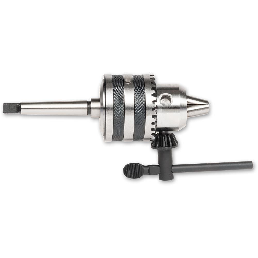 A good general purpose drill chuck with a B16 taper in the back, equally suitable for use in pillar drills and lathes. The jaws close right down to almost nothing for use with very small drills. Available with a choice of Morse 1, 2 or 3 arbor. Maximum capacity 13mm, chuck key included.