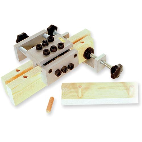 Muodostaa joko E- tai L-liitoksia jopa 32 mm:n (1.1/4") paksuiseen puuhun. Tämä alumiininen puristusjigi liukuu terästankojen päällä ja holkit on valmistettu karkaistusta teräksestä ja ne ovat vaihdettavissa. Jigin pääosassa on puristin puun pitämiseksi paikallaan porauksen aikana ja toinen puristin lautojen kiinnittämiseksi yhteen jigin asentoa säädettäessä. Reiät porataan molempiin lautoihin samaan asetukseen, joten tarkka kohdistus on taattu. Tämä jigi tuottaa erinomaisen tuloksen. Sopii 6 mm:n, 8 mm:n ja 10 mm:n tapinrei'ille. Toimitetaan karkaistuilla teräsholkeilla 6 mm:n, 8 mm:n ja 10 mm:n tapille.