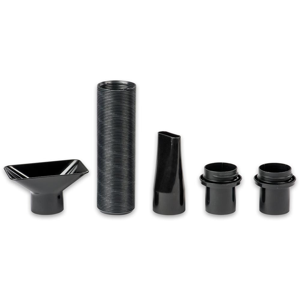 Tämä sarja on aito ongelmanratkaisija. Se koostuu halkaisijaltaan 63 mm:n pituisesta kestävästä polypropeeniletkusta "Flex Form Hose", kapeasta suuttimesta ja leveästä suuliittimestä. Voit taivuttaa, kiertää ja kääntää haitarimaista Flex Form -letkua ja se säilyttää muotonsa. Sen avulla voit sijoittaa kapean suuttimen tai leveän suukappaleen tiettyä poistotehtävää varten. Letku on riittävän jäykkä pysyäkseen paikallaan useimmissa sovelluksissa (saattaa tarvita hihnaa avuksi), mutta riittävän joustava muokattavaksi käsin. Sarja antaa sinulle paremman pölynhallintatarkkuuden työpajasi ympäristössä. Muotoiltujen suuttimien ansiosta tämä nivellettävä letku mahdollistaa pölynpoiston sieltä, missä sitä eniten tarvitaan. Liitä letku pölynimuriin ja liitä se sitten sorviin tai puuntyöstökoneeseen ja olet valmis töihin. Letkusarjan avulla pölynpoisto hoituu sorvista, penkkihiomakoneesta, juotosasemasta, vannesahasta, jyrsinpöydästä, rullasahasta, pylväporasta jne. Tämän letkun monipuolisuus on vertaansa vailla pölynpoistotarvikkeiden joukossa. Letkun pituus supistuu 300 mm:iin ja laajenee 915 mm:iin asti. Mukana 2 suutinta ja 2 kierretappia. Tapit ovat 55 mm pitkiä, ulkohalkaisija 59 mm ja sisähalkaisija 55 mm. HUOM. Älä käytä suuren tilavuuden purunpoistolaitteen kanssa, sillä ilmavirtaus ei riitä.