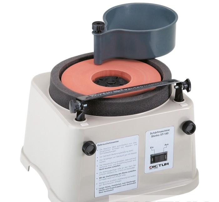 Sharpening wheel:Japanese waterstone, grit 1000, Ø 180 x Ø 70 mm, thickness 20 mm, steel mount, wheel nut, splashguard.Motor: 220 V, 125 W, 50/60 Hz, 450 RpM gear-driven.Casing: Plastic, tool rest adjustable in height and angle. Water container with valve, drain tube.Overall weight approx. 5.5 kg.