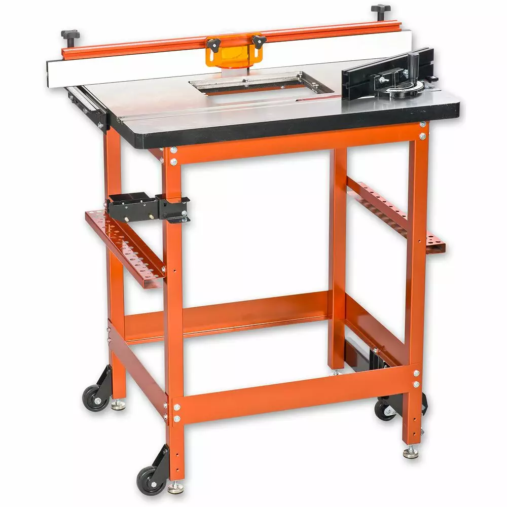 UJK: n pöytäjalusta on tukeva. Siinä on jalkakäyttöiset taittuvat pyörät helpon liikuteltavuuden mahdollistamiseksi. Jalustassa on siisti teline, jossa voit säilyttää suosituimmat jyrsinterät helposti käsillä ja lisäksi teline vastekokoonpanon varastointiin. Seisontakorkeus noin 890 mm.