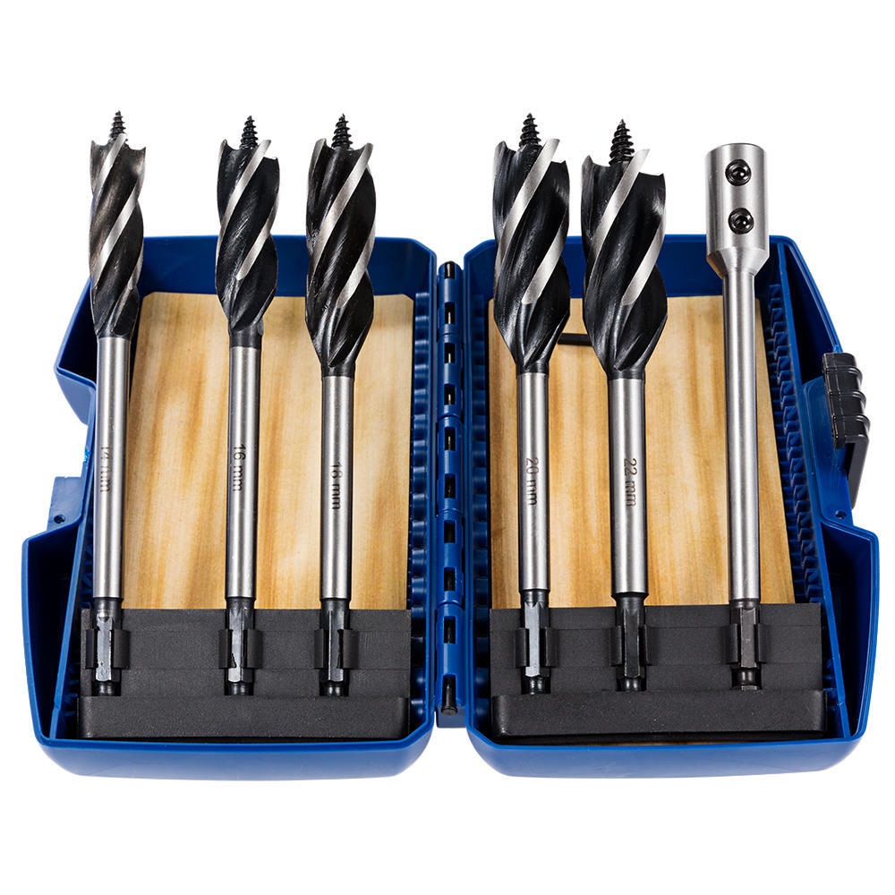 Tällä ruuviteräsarjalla poraat erikokoisia reikiä puuhun nopeasti ja siististi. Näiden terien neljä suippenevaa leikkuureunaa nopeuttavat lastunpoistoa ja varmistavat tehokkaan työntövoiman puuhun. Akseli mahdollistaa nopean teränvaihdon ja estää teriä liukumasta istukan läpi.