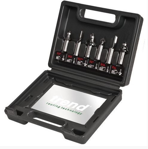This product includes: 1 x Straight 6.3mm dia x 16mm cut 1 x Straight 12.7mm dia x 25mm cut 1 x V-groove 45 deg x 12.7mm dia 1 x Guided round over R6.35mm 1 x Guided round over R9.5mm 1 x Guided ogee... Lue lisää